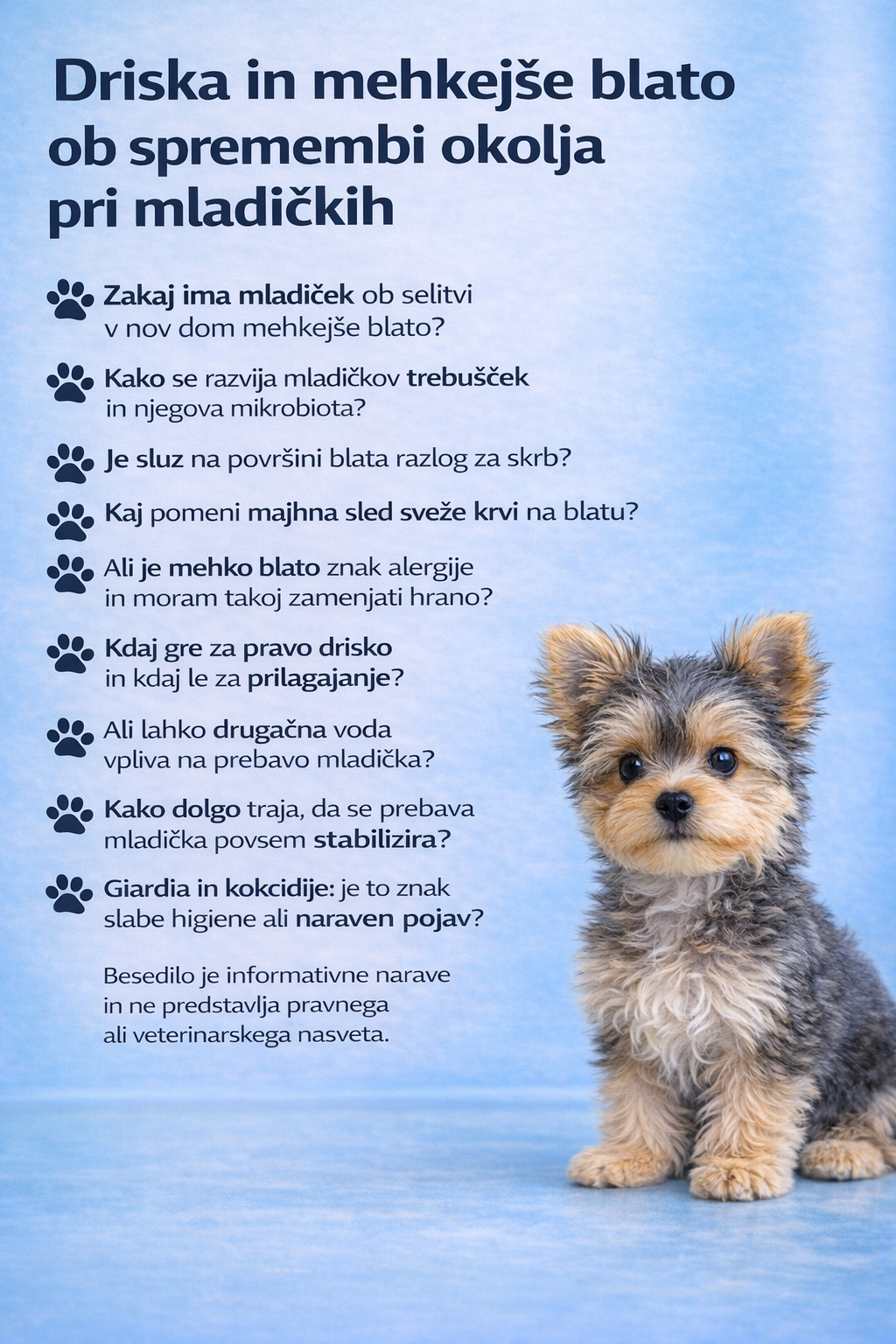 Interaktivno kazalo 1. Ali lahko sprememba okolja pri psu sproži prebavni odziv, primerljiv s potovalno drisko pri ljudeh? 1.1 Kateri so najpogostejši vzroki prebavnih težav … Nadaljujte z branjem 🐾 Driska in prebavne motnje pri psih ob spremembi okolja: vzroki, mehanizmi in posebnosti pri mladičkih