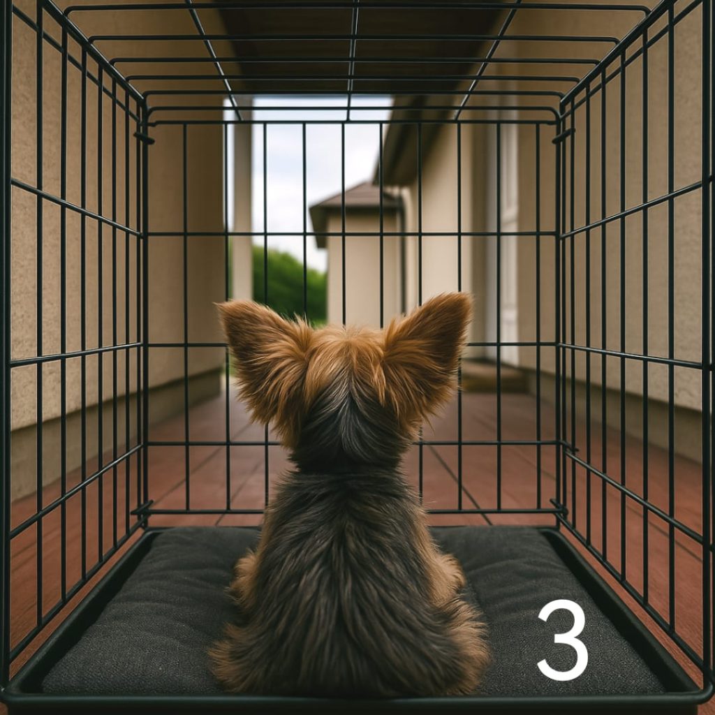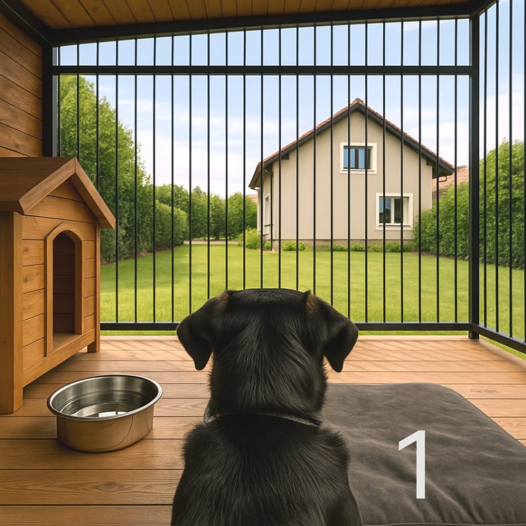 3️⃣ Pes v sobni kletki, ki je tokrat za spremembo zunaj, da jo vidijo vsi, ki hodijo mimo, in ni več skrita med štirimi stenami, kot je bila prejšnje dni, mesece, leta? — ZAGOTOVO