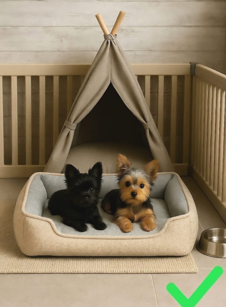 🔹 Nočno bivanje v kletki je sprejemljivo, če pes spi, ima dovolj prostora, ni fizično omejen pri iztegu telesa in se zjutraj lahko nemoteno odpravi na potrebo.